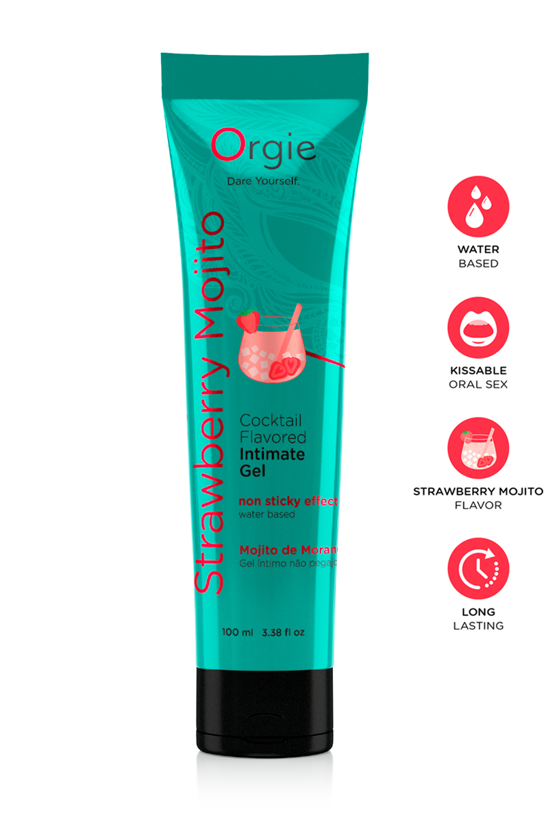 Gel intime Orgie à base deau, embrassable, longue durée, au goût De Cocktail fraise Mojito, en tube de 100ml.
