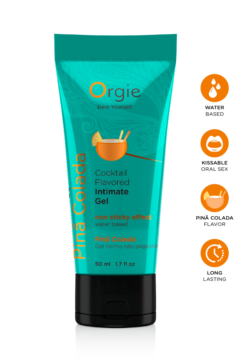 Gel intime Orgie à base deau, embrassable, longue durée, au goût de Cocktail Piña Colada, en tube de 50ml.
