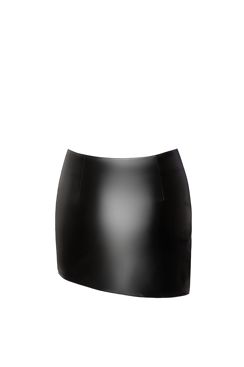 Mini jupe évasée asymétrique en wetlook noir mat. Ultra sexy, elle ne cache que l'essentiel.