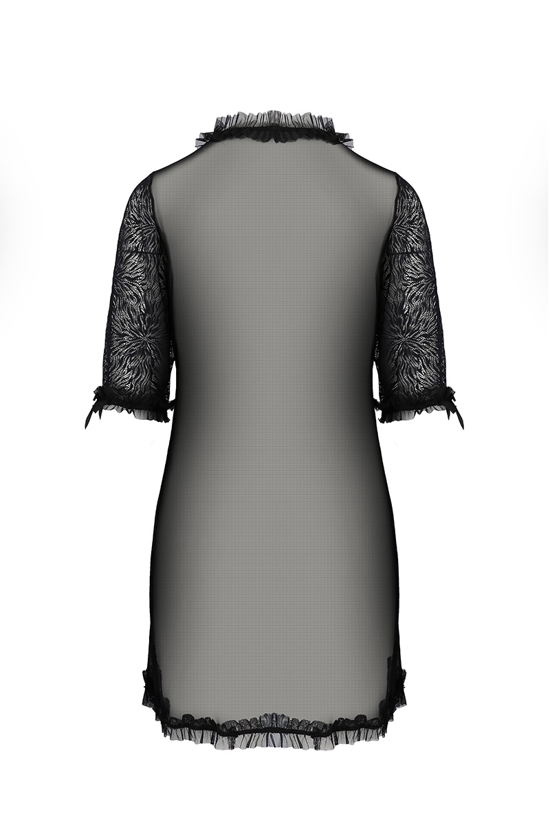 De coupe droite et mi-long, ce déshabillé vous met en valeur avec sa riche dentelle aux motifs effilés, et la transparence du tulle finement ajouré.