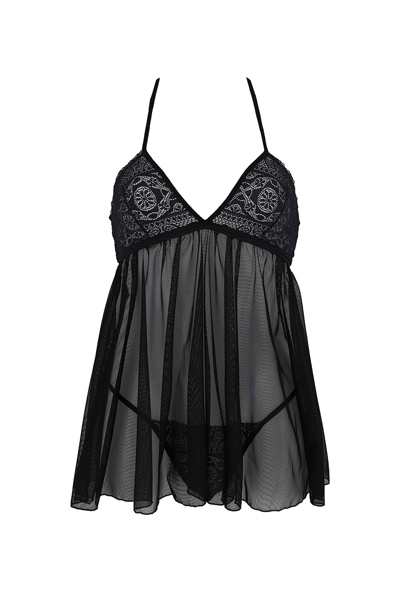 Fluide et très courte, la nuisette répand le tulle froncé finement ajouré au bel effet de transparence.
